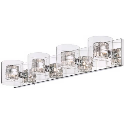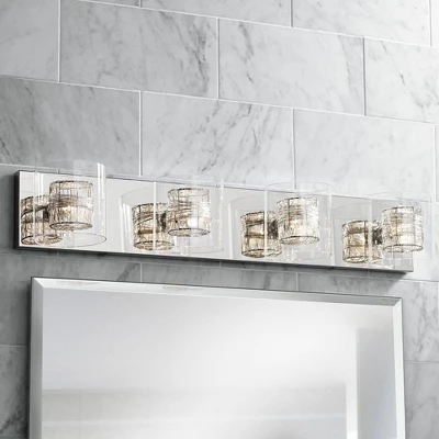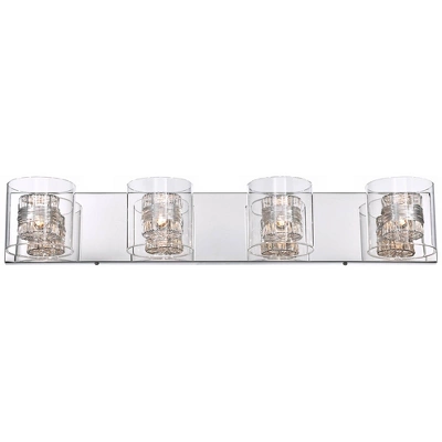 Illuminate a bath or living space with this contemporary four-light fixture from Possini Euro Design. This bathroom wall light comes in a sleek chrome finish that adds a modern shine. The clear glass cylinder shades have hand-wrapped aluminum wire decorations inside, adding an element of visual interest. Can be installed horizontally or vertically.