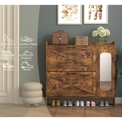 This Shoe Storage Cabinet redefines entryway organization by merging fashion-forward design with unmatched practicality. Featuring a full-length mirror on the cabinet door, it lets you perfect your look while saving time. The innovative flip-drawer system offers generous storage: two drawers with adjustable layers hold shoes vertically, while the main cabinet accommodates bulkier items. Customize dividers to fit everything from delicate flats to knee-high boots.Crafted for modern living, its compact footprint fits snugly in narrow spots—hallways, entryways, or living rooms—without sacrificing elegance. The raised metal legs not only add durability but also create under-cabinet space for slippers or smart devices. Top it with potted plants or décor using the secure fence ledge, ensuring items never topple.Built to last with eco-friendly materials and a rich brown finish, this cabinet resists scratches and dust. Assembly is a breeze, requiring no tools—just snap components together.