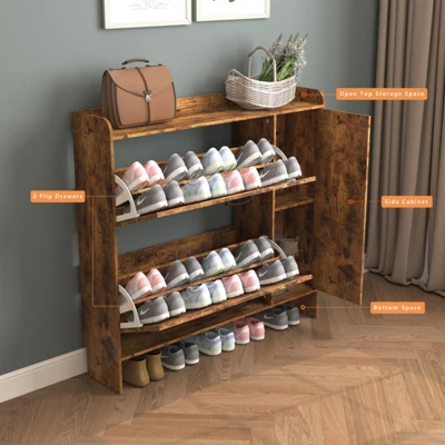 - Effortless Large Capacity Storage: Two flip drawers + main cabinet hold 12-15 pairs of shoes; adjustable dividers fit boots, heels, or flats while maintaining a clutter-free, modern look.