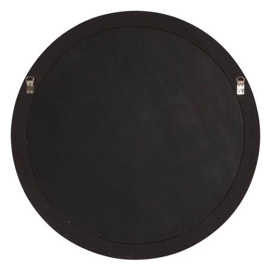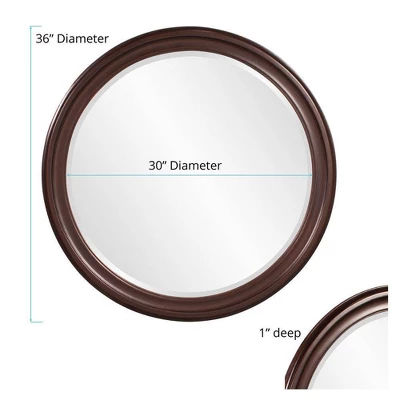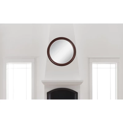 The George Mirror features a rich chocolate brown lacquer finish. The Round frame is made from wood and is accented with grooves for added depth and character. For more added detail the mirror features a one inch bevel. Its Transitional style makes this mirror a favorite for bringing some flair to your decor. This simple yet stunning piece would be a great addition to any room. It is a perfect focal point for an entryway, bathroom, bedroom or any room in your home. D-rings are affixed to the back of the mirror so it is ready to hang right out of the box!