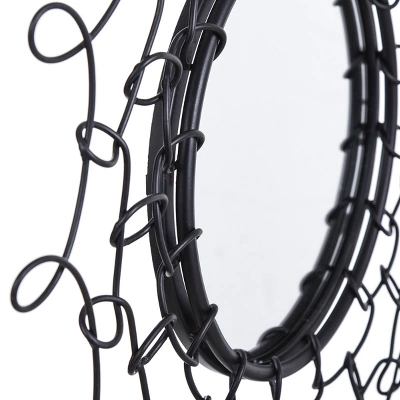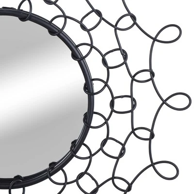 The Luka farmhouse mirror uses a whimsical design in open looped black finish metal to create a unique rustic character. This on-trend mirror features a round reflective center that makes it a useful home accessory for entryways, living rooms, dining areas, and more. It’s an expertly crafted piece that sits close to the wall for a seamless ready to hang look. This piece exemplifies superior product design and great styling. It will pair well with farmhouse styling. If you put it in the bedroom or family room, this decor stands out. Suitable for residential use in a dry location. Due to the way this piece is made, no two are exactly alike and color finishes may vary from piece to piece. Due to lighting and monitor differences, actual colors and finishes may vary slightly from what appears online