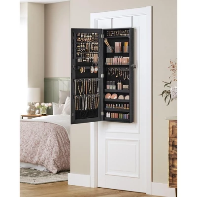 Serene Daily Routine: After carefully choosing your dress, how should you complete the look? Just open the door of this jewelry cabinet to find out! With all your jewels here, it’ll be easy to choose the right ones. Ah! There are also places for cosmetics! Now you can admire your complete look in the frameless full-length mirror. With a morning like this, you’re off to a good start!Serene Daily Routine: After carefully choosing your dress, how should you complete the look? Just open the door of this jewelry cabinet to find out! With all your jewels here, it’ll be easy to choose the right ones. Ah! There are also places for cosmetics! Now you can admire your complete look in the frameless full-length mirror. With a morning like this, you’re off to a good start!A Place Makes Your Jewelry Feel at Home: Don’t leave your cosmetics and jewelry messed up in drawers or at the mercy of dust! This jewelry mirror cabinet displays them like they’re in a showcase, and the lockable design with 2 keys protects them both from dust and prying hands. They’ll immediately feel at ease in this safe and refined jewelry cabinet!Specifications:Material: MDF (Medium Density Fiberboard)Product Size: 14.8″L x 3.8″W x 42.5″H (37.5 x 9.7 x 108 cm)Product Weight: 19.8 lb (9 kg)Package Contents:1 x Jewelry Cabinet2 x Key1 x Accessory Kit1 x InstructionsSONGMICS Notes:The inner width of the hook is 2″, which only fits doors with a thickness of 1.7″ or less. Please note that the cabinet can’t be hung on any doors that are thicker than 1.8″.Children should not climb on or play with the product for safety reasons.