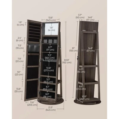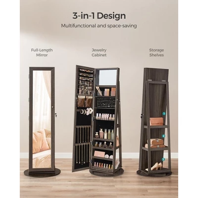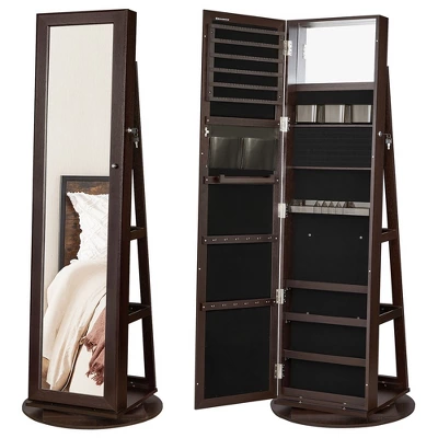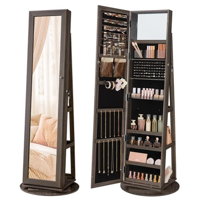 Our jewelry cabinet is the perfect companion for any woman with a rich collection of jewelry. This 360 degree rotating jewelry cabinet keeps all your jewelry off drawers and safes and stores them in one place. And the lockable design helps keep your jewelry secure. The full length mirror offers you a head-to-toe view of your outfit. With 360 degree rotating base, you can do some makeup with easy access to your jewelry and cosmetics. Made of durable MDF, this free standing jewelry armoire ensures long term use. This mirrored jewelry armoire will add a sophisticated look to your room.