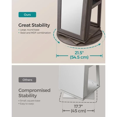 - 360 Degree Rotating Base: Enjoying with the 360 degree rotating base, the mirrored jewelry organizer is more flexible to meet your different needs. 360 revolving angle not only help find your essentials easily, but also give you a proper position to look at yourself in the mirror.