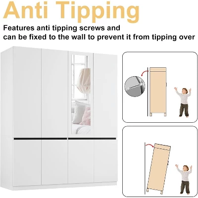 Elevate your bedroom organization with this stylish 4-door wardrobe featuring a sleek white finish that blends seamlessly with any decor. The minimalist handle-free design creates a contemporary look, while the built-in full-length mirror adds functionality for daily use. Inside, you’ll find two full-length hanging rods for clothing and two spacious compartments perfect for folded items, bedding, or seasonal storage. Crafted from durable MDF with reinforced metal hardware, this wardrobe offers lasting quality and stability. The elevated base provides secure support, and the smooth surfaces make cleaning effortless. Designed for both style and practicality, this freestanding armoire provides ample storage while maintaining a clean, modern aesthetic in your bedroom.