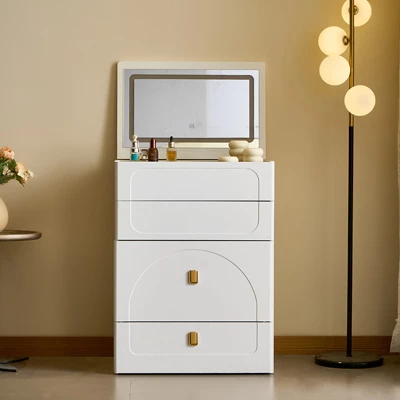 3-in-1 Vanity Desk Set: Compact dressing table with flip up mirror and stool, when flipped up the table top is a stylish makeup vanity, when closed it is a nightstand with extra storage space, which can also be used as a work station at home, it’s a simple, convenient and practical furniture3-Color LED Flip Makeup Mirror:Our Flip Makeup Mirror is equipped with LED lights that provide three lighting effects: white light, natural light and warm light. Click to adjust the color and long press to adjust the brightness, which can easily meet your various make-up needs during the day or nightAmple Storage Space: This Vanity Table is equipped with 7 inches deep hidden storage space and visual drawers to easily organize all kinds of cosmetics, perfumes, makeup brushes and jewelry, three hidden storage drawers and removable cushioned stools provide more storage space, while curved corners are designed to avoid bumps and injuries when your family is using itVisual Desktop: The top tabletop drawer is designed with 6 separate compartments where you can select your makeup and jewelry through the clear tempered glass top