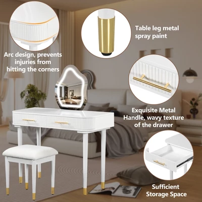 Well Organized: With large desktop and 2 drawers, provide enough storage space for makeups, blow dryer, jewelry, perfume.Lighted Mirror : The dressing table has a specially shaped illuminated mirror that turns on the lights at the touch of a screen, giving you a precise, professional makeup experience.Easy Assemble: The vanity table set comes with all the necessary hardware and clear instructions. Lay out each board by number and follow the steps. No additional tools are needed, making assembly quick and easy.