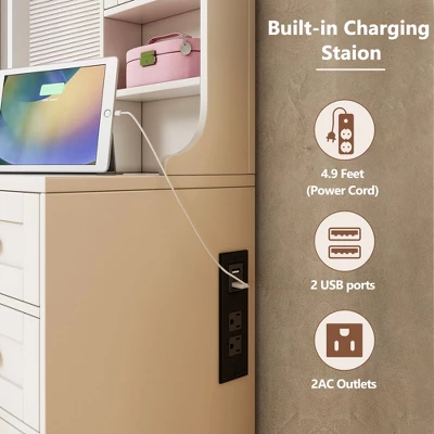 Convenient Charging: This charging station is equipped with two electrical outlets and two USB ports, offering convenient charging options for your electronic devices. Say goodbye to the hassle of searching for outlets and untangling cords.About Installation: Our dresser is a little more complicated to assemble than other small furniture. Don’t worry, we’ve got you covered! We provide easy-to-follow instructions and labeled accessories to make the installation process a breeze.
