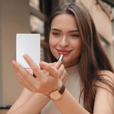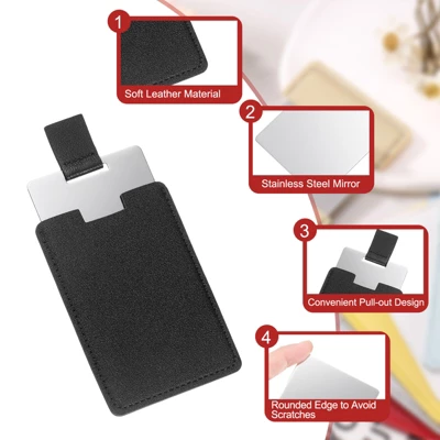 This compact makeup mirror combines style and practicality, perfect for on-the-go touch-ups. Crafted from durable PU leather, the outer shell provides a comfortable grip and protects the mirror from scratches. The stainless steel mirror is resistant to rust and impact, ensuring long-lasting use. Its ultra-thin design fits easily into your purse or pocket, making it an ideal travel companion. The safe design features rounded corners and polished edges, preventing any accidental scratches. Whether for daily makeup, work, or travel, this mirror is a versatile accessory for any occasion.