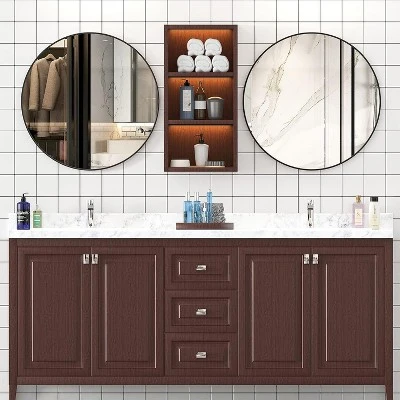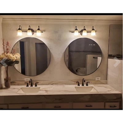 The modern shape and the deep inset of the glass surrounded by the matte black finish of the frame gives this mirror a soft, contemporary feel.Built with 1/4-inch thick top-grade glass and pure silver backing, provide you with a clear and flawless perfect mirror no matter when.With an outside frame diameter of 30 inches, this mirror making space appear larger and brighter, ideal for bathroom, entryway, living room, and more.Surrounding by the rust-proof metal round frame, while edges and backing well wrapped the mirror to ensure stability and durability.Come with matched screws, pre-install metal hook for hassle free installation.