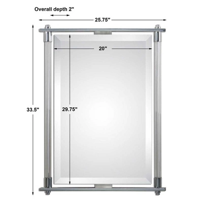 Add a refined touch to your space with the Uttermost Adara Vanity Mirror, designed by Carolyn Kinder. Crafted with ribbed glass columns and polished chrome-plated accents, this elegant mirror exudes sophistication and modern glamor. Measuring 33.5″ high × 25.75″ wide × 2″ deep, it features a generous 1.25″ beveled mirror that subtly enhances light and depth. The sleek silhouette is perfect for bathrooms, bedrooms, or dressing areas. Built for versatility, this mirror may be hung either vertically or horizontally, making it a functional centerpiece for any upscale interior.Key Features: