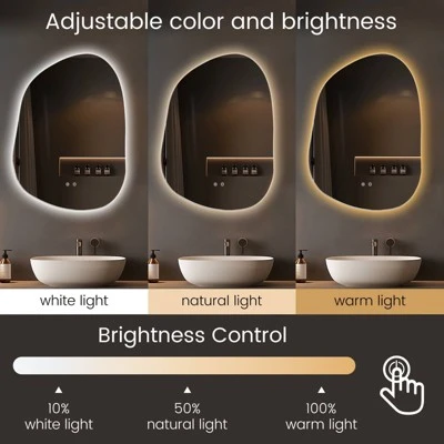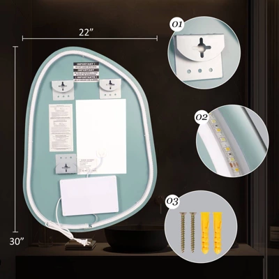 Upgrade your bathroom with this 22″ x 30″ eco-friendly LED mirror, designed for both style and sustainability. Crafted with a copper-free silvered reflection layer, it delivers a crystal-clear, high-definition image while reducing environmental impact. The integrated dimmable LED lighting offers three adjustable color temperatures, controlled effortlessly via a touch sensor. A built-in anti-fog function ensures a clear view even in steamy conditions, with separate switches for energy-efficient operation. The moisture-resistant aluminum frame, IP54 waterproof rating, and a lifespan exceeding 50,000 hours make this mirror a durable, long-lasting addition to any bathroom. Versatile installation options allow for plug-in or hardwired setup, seamlessly integrating into your space.